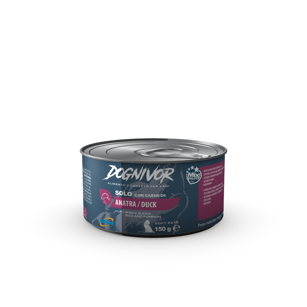 Composizione: carne di anatra 88%, riso 4%, zucca 2%