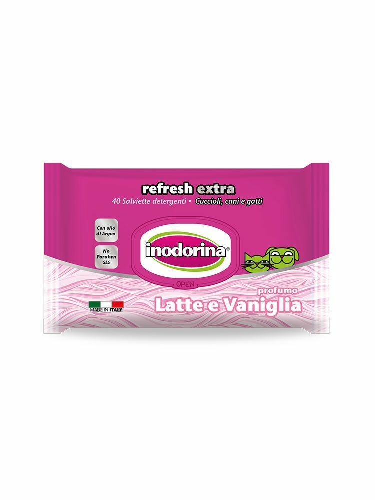 Salviette detergenti e profumate in tessuto resistente, umidificate con una formulazione unica a base di olio di argan, ricco di vitamine (A,E,F) e noto per le sue proprietà lenitive, nutrienti ed idratanti. Inodorina Refresh eXtra, rispettando il Ph naturale, pulisce, deodora, e lucida il manto di gatti, cani e cuccioli rilasciando una gradevole profumazione.